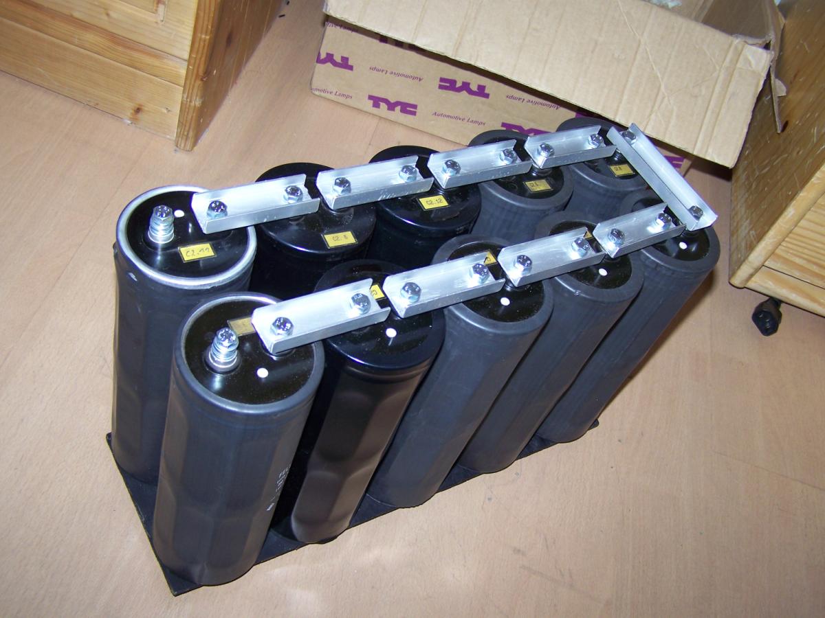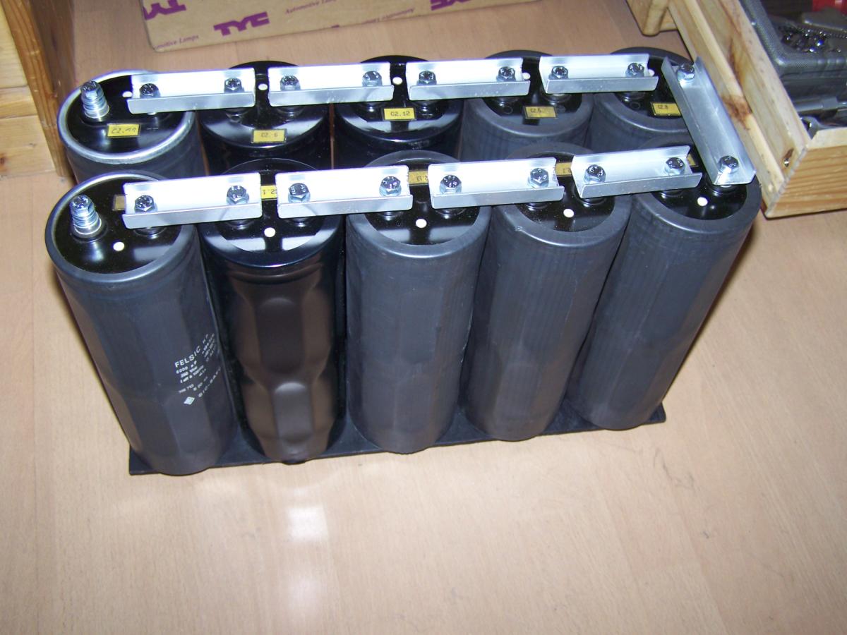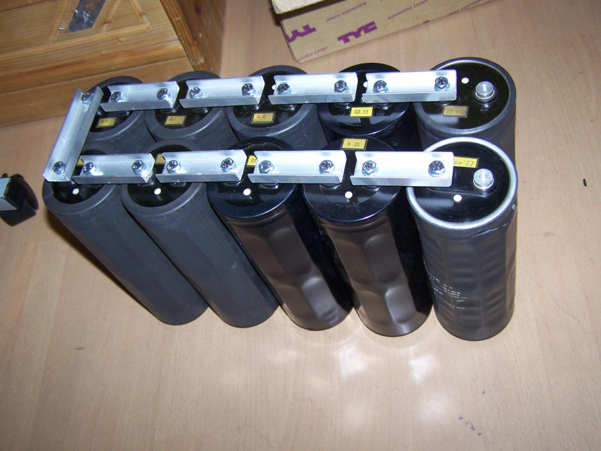 Hier meine Kondensatorbank: Daten: Energie: Bilder: Hier erstmal die 10 Elko´s: Die Verbindungsteile aus einer alten Aluschiene ausgesägt: Hier die Elko´s nur an den Kontakten zusammengeschraubt: Mit Bodenplatte: Mallllööööör: Hier fertig zusammengebaut: Geladen wird mit einem MOT mit Gleichrichter.