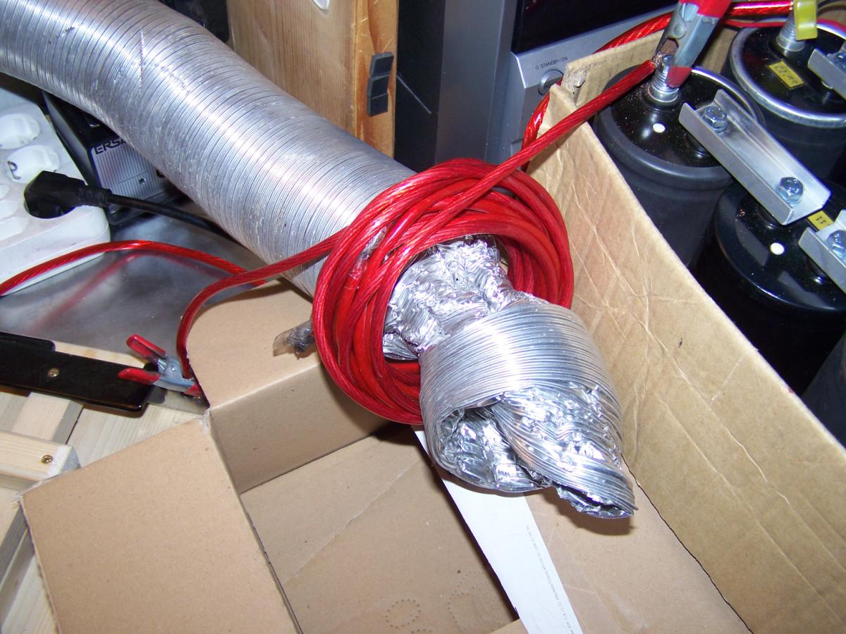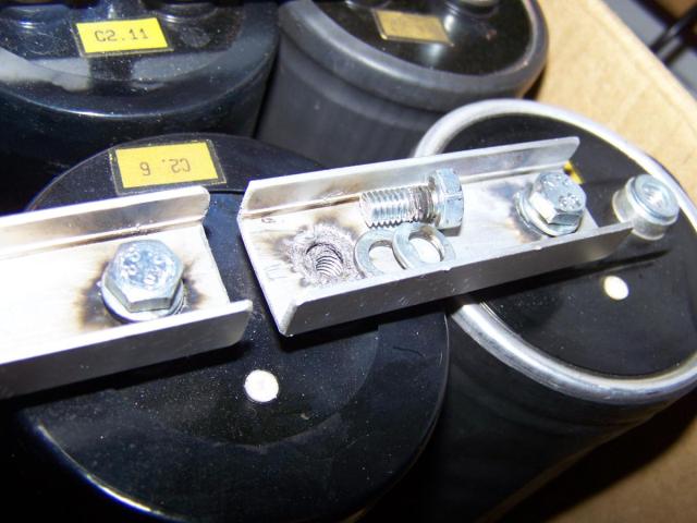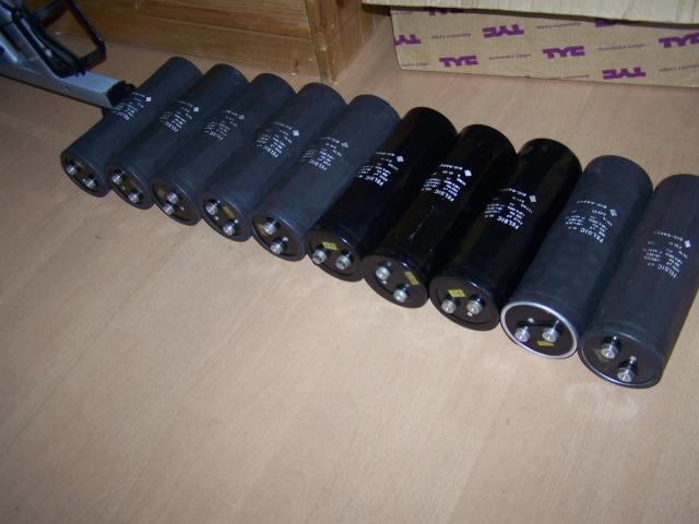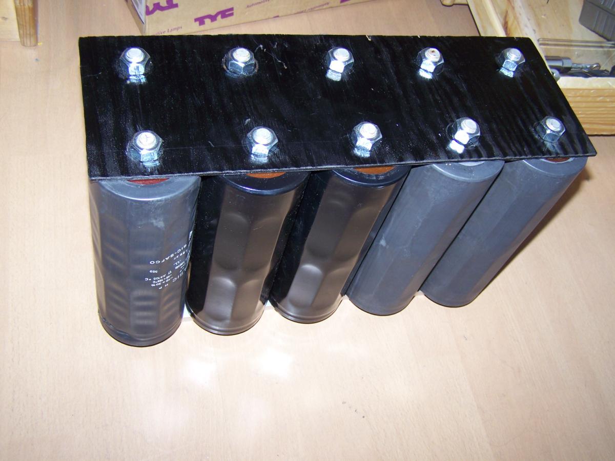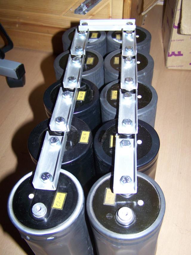 Hier meine Kondensatorbank: Daten: Energie: Bilder: Hier erstmal die 10 Elko´s: Die Verbindungsteile aus einer alten Aluschiene ausgesägt: Hier die Elko´s nur an den Kontakten zusammengeschraubt: Mit Bodenplatte: Mallllööööör: Hier fertig zusammengebaut: Geladen wird mit einem MOT mit Gleichrichter.