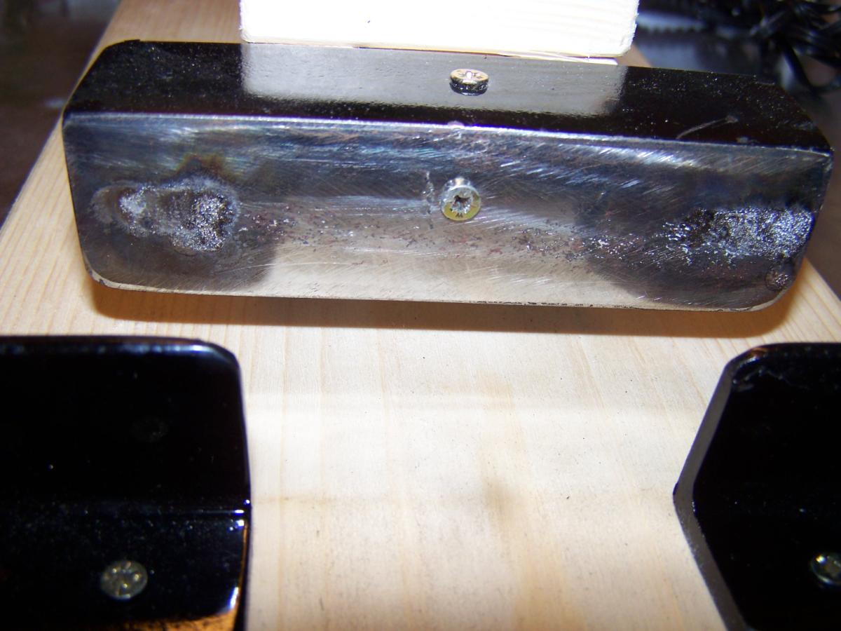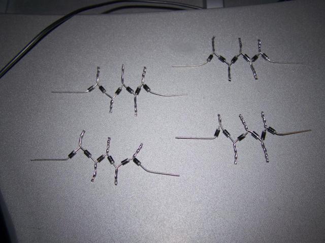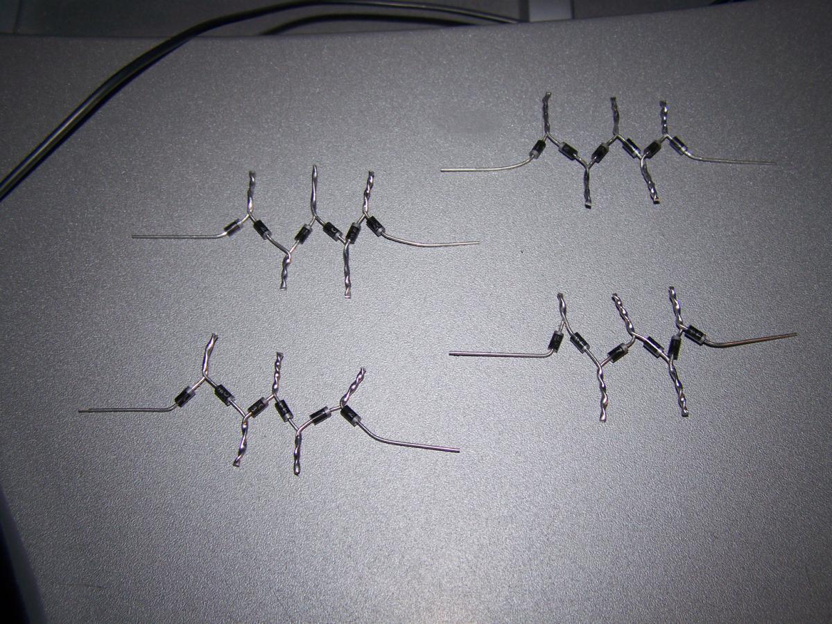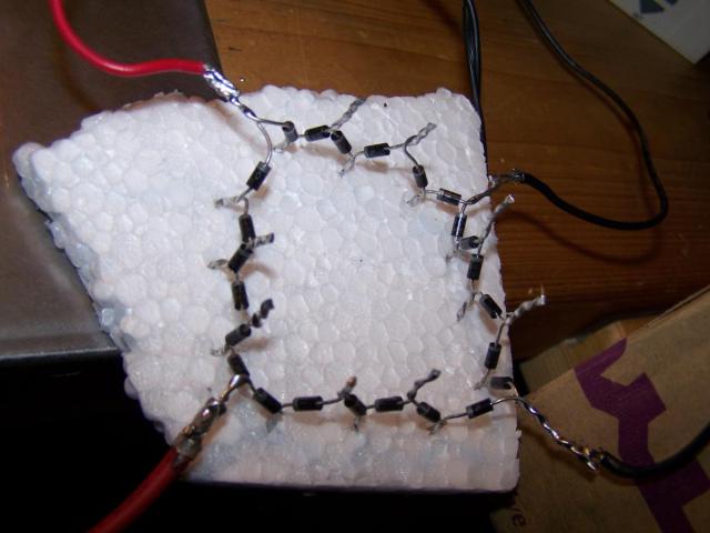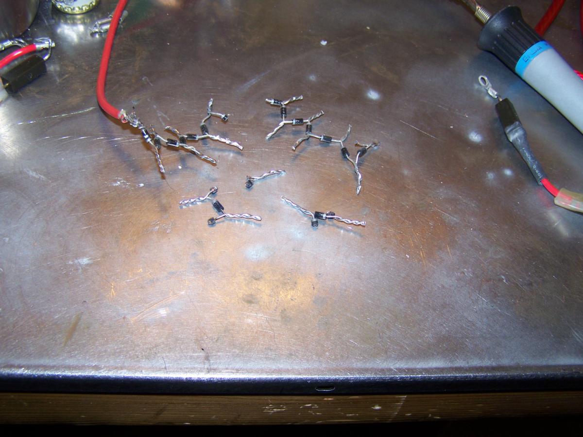 Erster Versuch war ein Gleichrichter aus 1N4007, je 6 Stück in Reihe: Das Ergebnis nach 3 mal aufladen: Für die starken Ströme musste auch ein geeigneter Schalter her: Nach einigen Schaltvorgängen Verschleißspuren: Spuren auch an den (weil Alugewinde) nicht ganz fest gezogenen Schrauben: Erste Versuche: