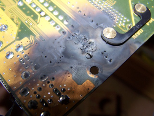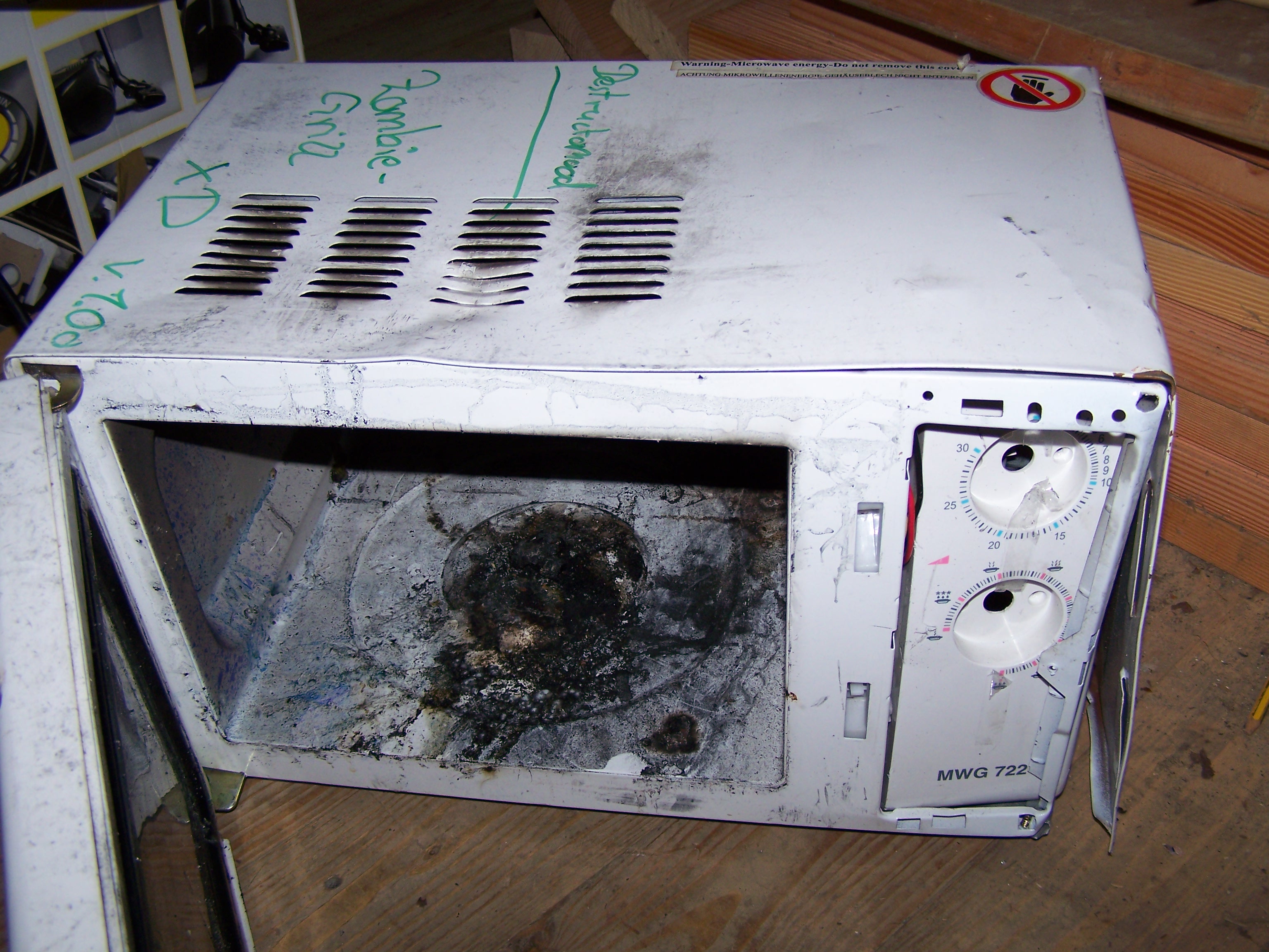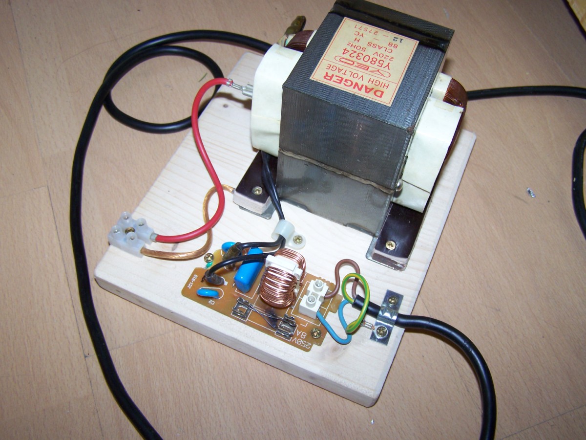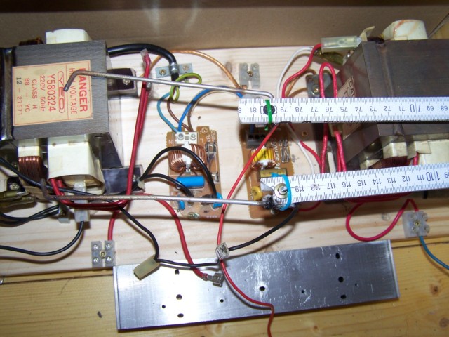 Ein letztes Bild von der Mikrowelle... Mainboardrückseite nach einer 4kv-Behandlung xD Das in den meisten Versuchen verwendete 2er Mot-stack (Sekundärseitig in Reihe geschaltet Mikrowellentrafo´s) ca. 4000V bei 1A Mein erster Mikrowellentrafo Meine Jakobsleiter